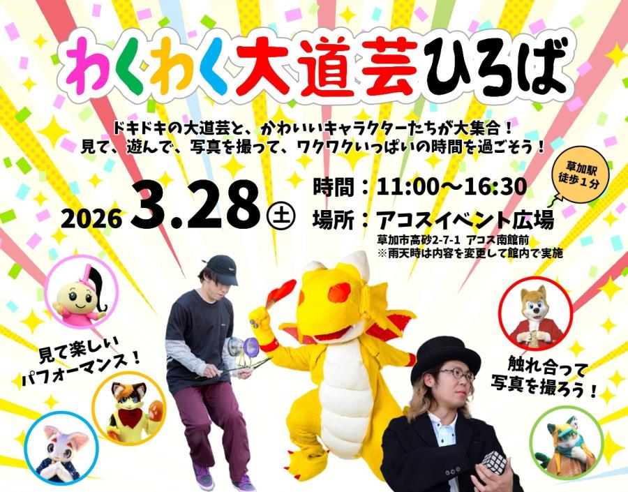 見て楽しい大道芸と、触れ合えるキャラクターグリーティングでワクワクの1日に!