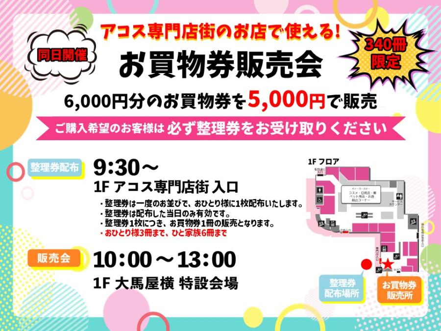 アコス専門店街で使える6,000円分のお買物券を5,000円で販売!先着340名様