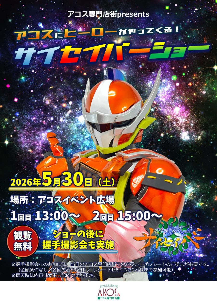 埼玉県のご当地ヒーロー「サイセイバー」がアコス専門店街に登場します。